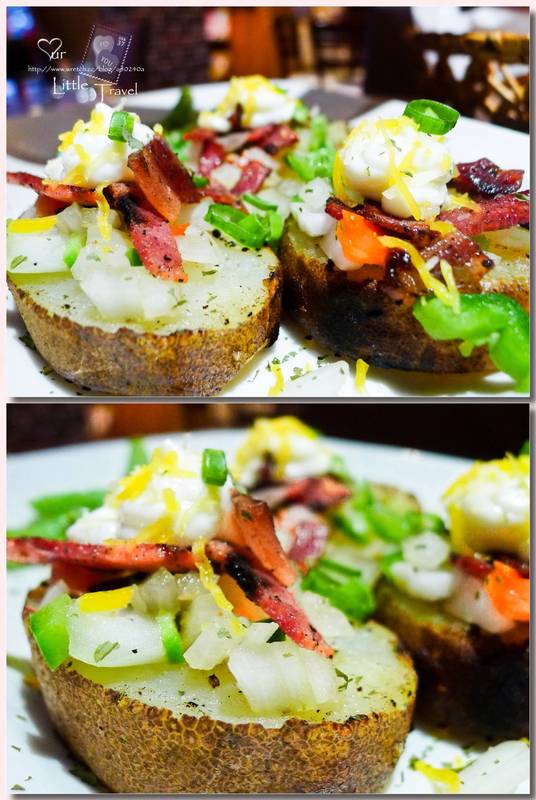 裘斯漢堡的烤培根馬鈴薯上面擺滿了洋蔥塊、烤培根、香蔥等餡料,